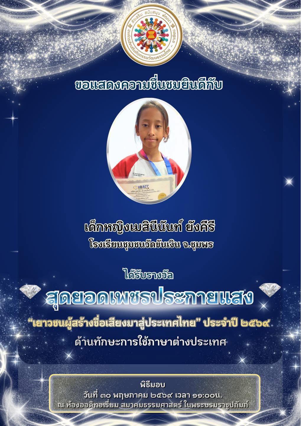 รางวัลอันทรงเกียรติ “สุดยอดเพชรประกายแสง” รร.ชุมชนวัดขันเงิน 7 เมษายน 25697 เมษายน 2026กมลกาญจน์ จิญกาญจน์ข่าว/กิจกรรม สถานศึกษา สำนักงานเขตพื้นที่การศึกษาประถมศึกษาชุมพร เขต 2 ขอร่วมแสดงความยินดีกับรางวัลอันทรงเกียรติ “สุดยอดเพชรประกายแสง” FacebookTwitterLine
